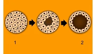 しかし受精卵が成立してしばらくすると、細胞分裂を起こします。 すると下の画像の、1番のようになります。