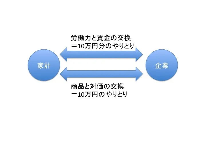ところで、各経済主体のお金の出入りの合計を見たらわかると思いますが、合計0になります。家計から見れば、労働力の対価として10万円を得ていますが、その10万円を商品の購入に充てている形になります。