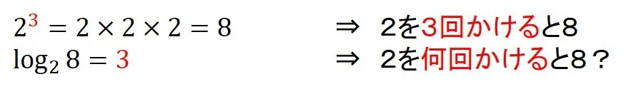 このように,指数は2を3回かけるという計算ですが,log8は2を何回かけた結果であるかを計算する関数です.