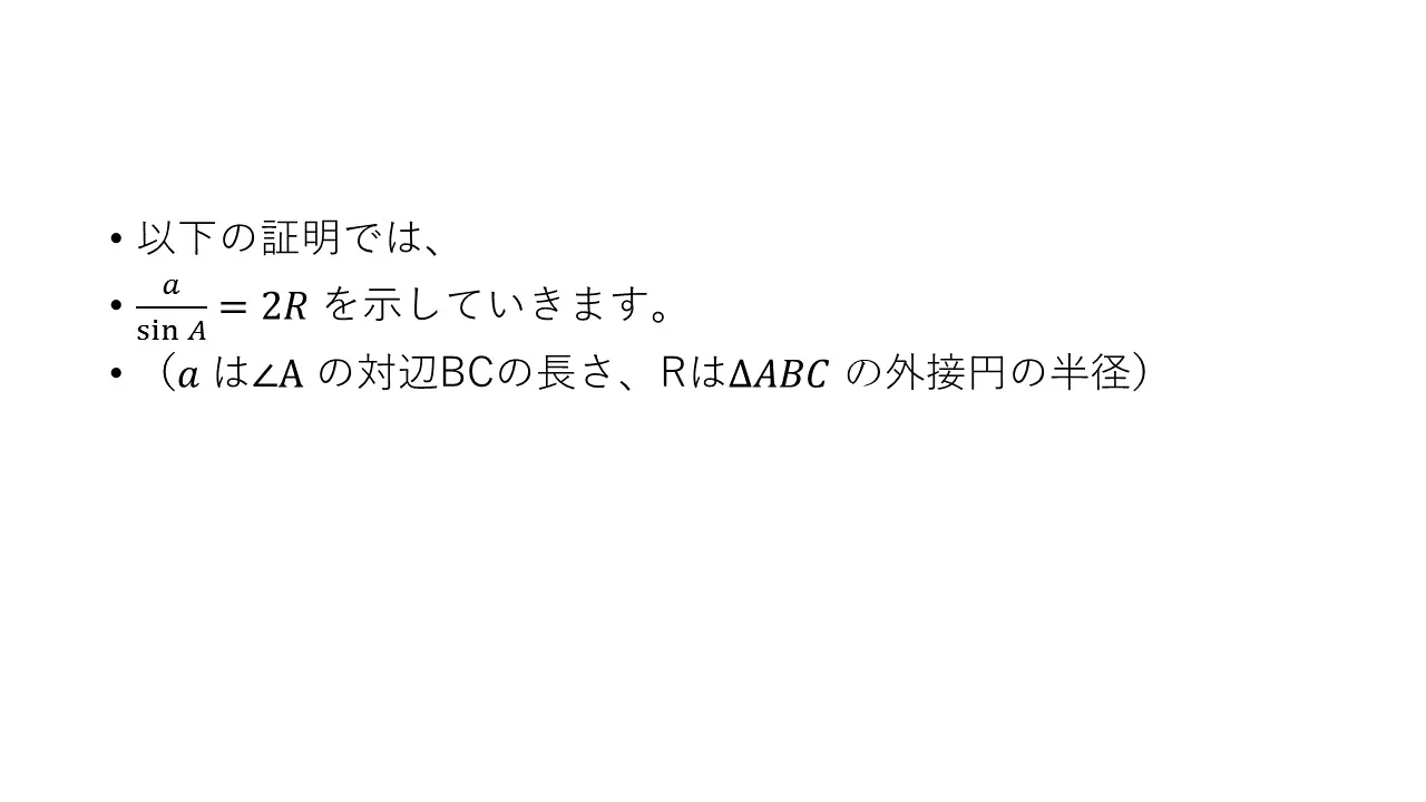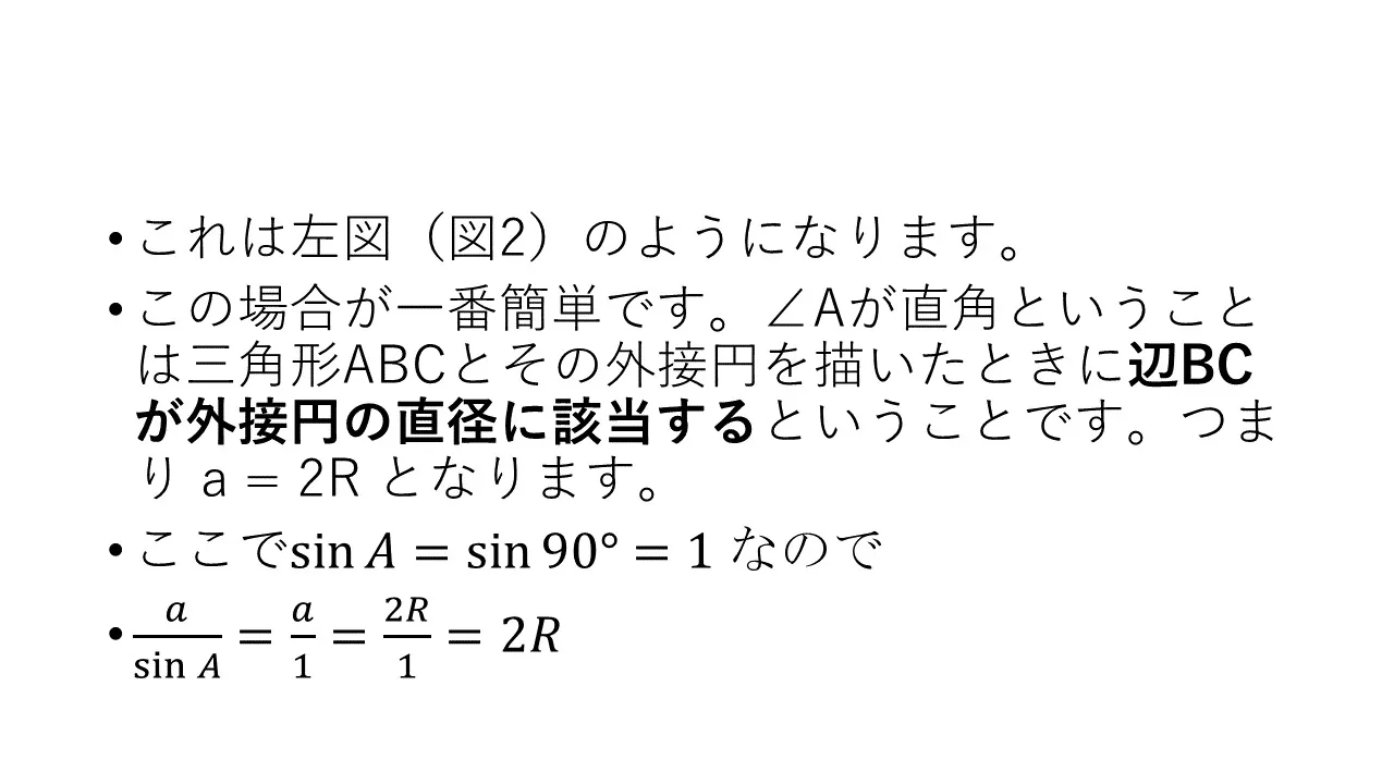 こちらは余弦定理に比べて図で直感的に理解できる分容易です。正確には3パターンに分けることができますが、基本は全て変わらなくて「三角形に対して外接円を描くこと」です!