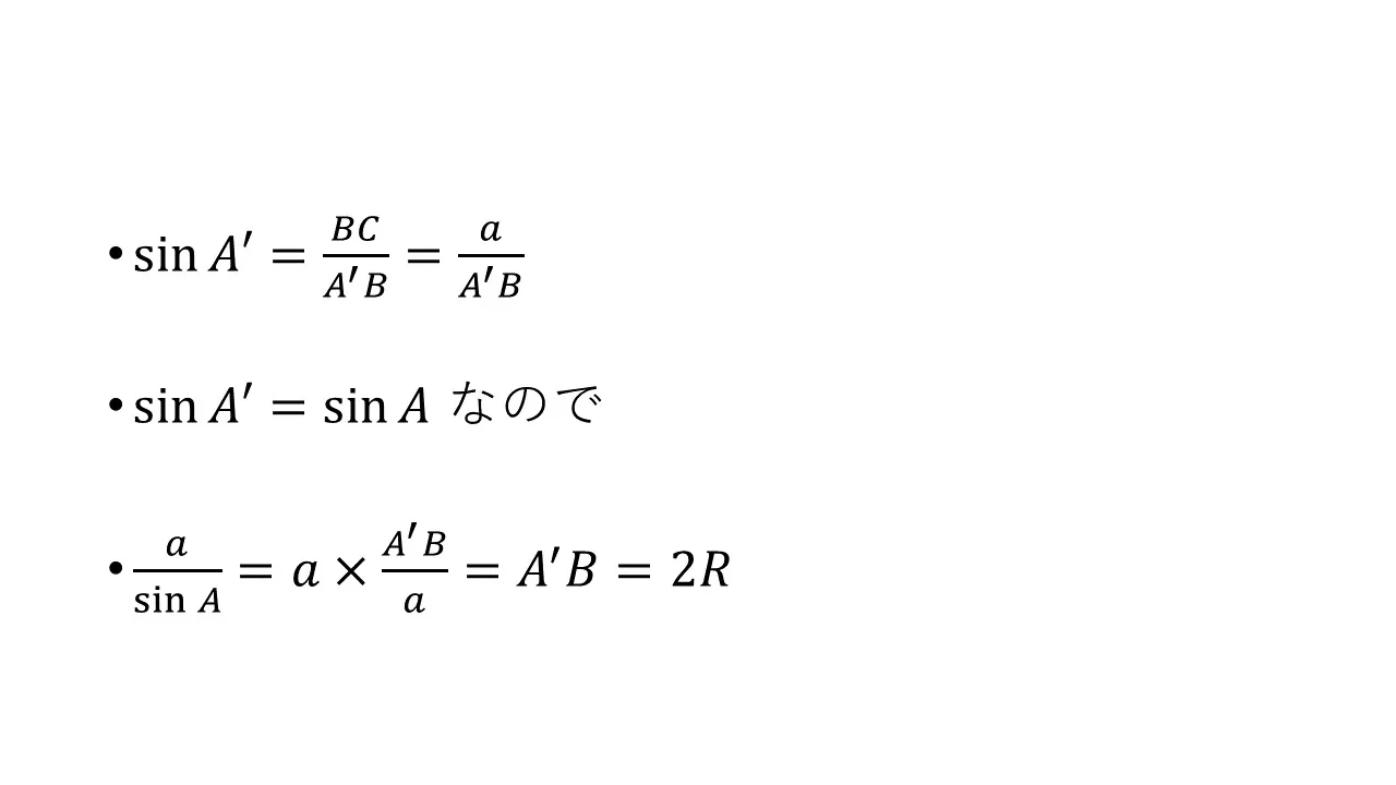 ∠BAC = ∠BA'C となります。もちろん sinA = sinA' となります。図にも書きこんでありますが、BA'が外接円の直径なので∠BCA'は直角になっています。よって