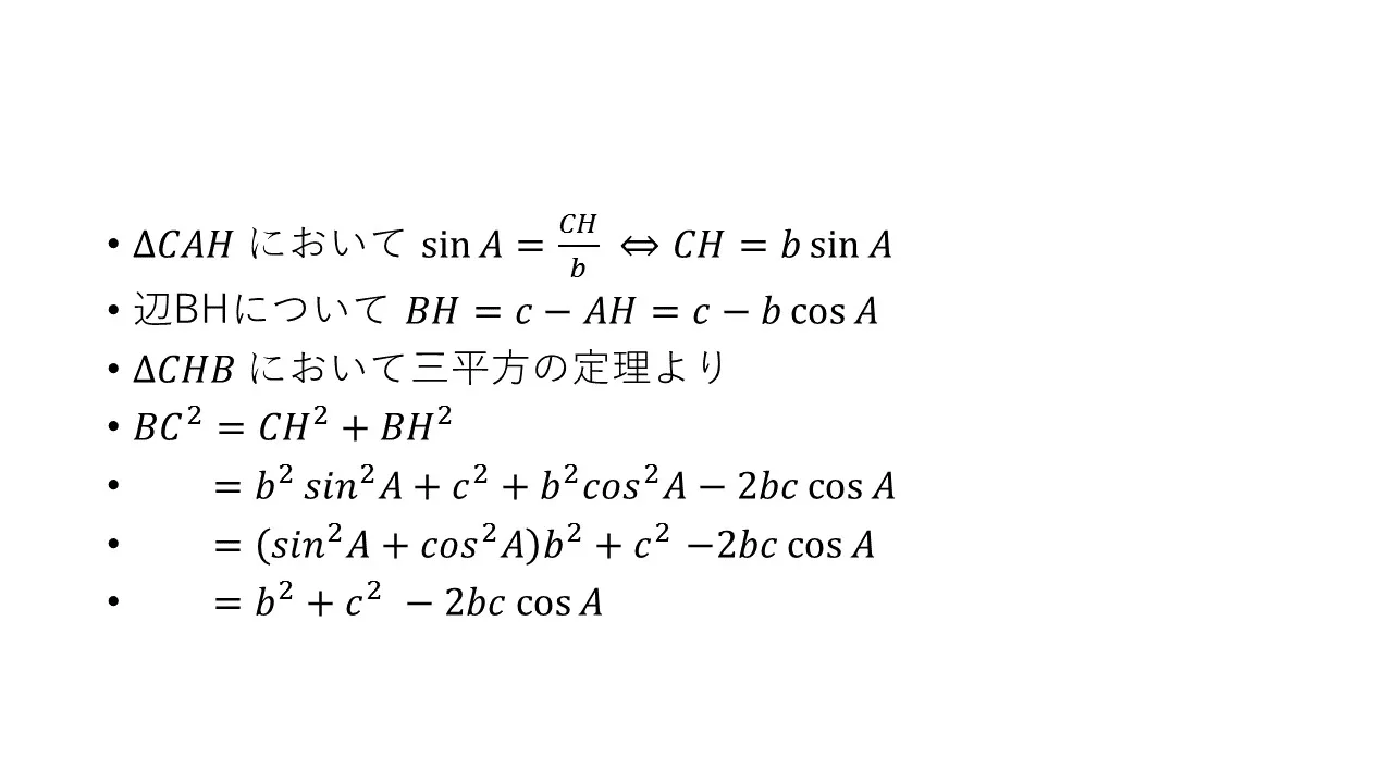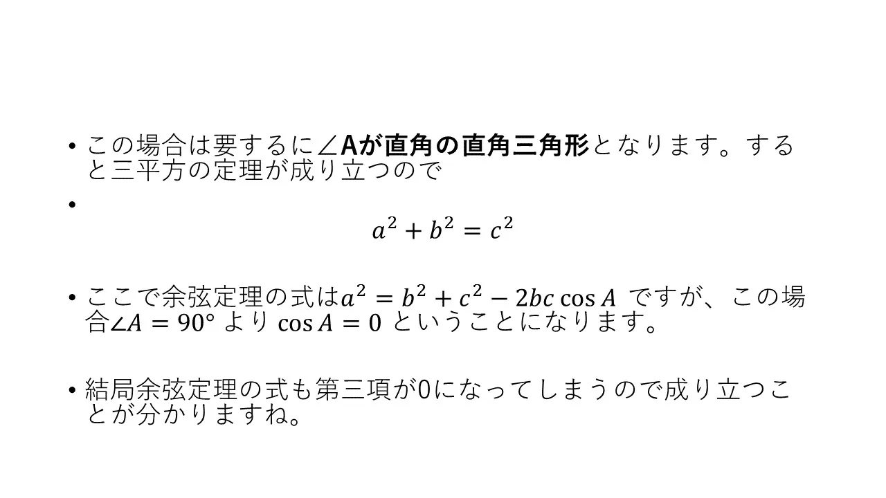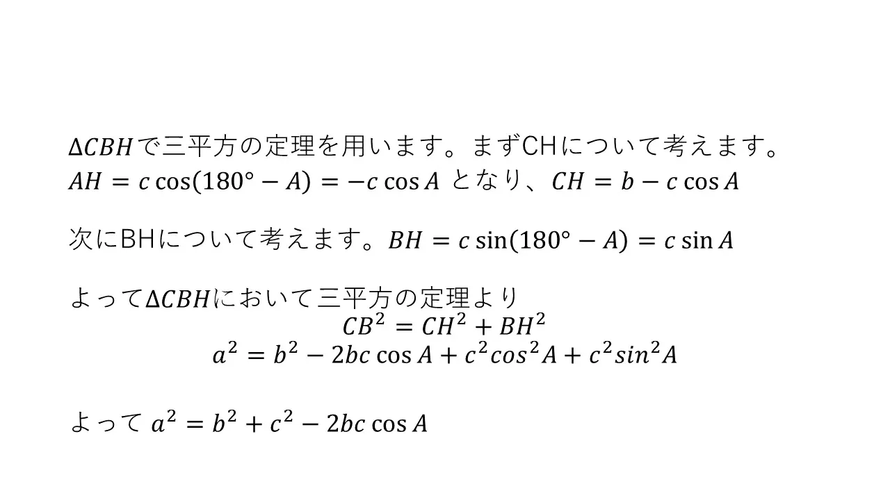 この場合は上図のようになります。ここも∠Aが鋭角の場合と同じで、最終的には三平方の定理を用いることに帰着します。