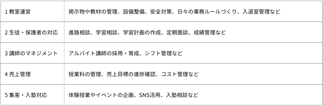 教室全体を管理するので教室長の仕事は多岐にわたりますが、以下の5つが主な業務です。