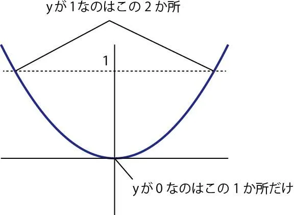 しかし、yが0の時だけは話が別です。2乗すると0になる数は、0しかありません。この時だけは、解が1つという状態が生まれます。グラフを見ながら考えると非常に簡潔に理解できます。