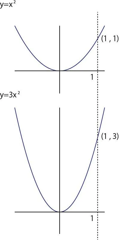 こちらも図にすると簡潔です。一次関数では比例定数の大小によって角度が急になったり緩やかになったりとしましたが、放物線の比例定数はその放物線の広がり方を変えます。