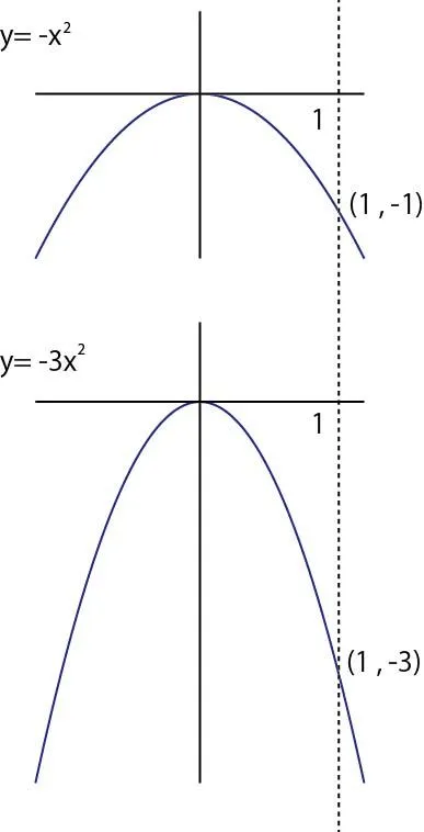 ここまで図形を殆ど下に凸向きの放物線で統一していましたが、最初に紹介した通り、上向きの放物線も存在します。上向きと下向きは、比例定数によって決まります。下図を見れば分かると思いますが、向きが変わっても他の部分は変わりません。