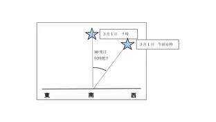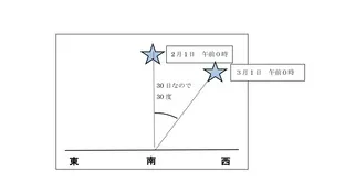 例題:2月1日の午前0時に真南に見えた星Aがある。星Aが3月1日に真南に見えるのは何時頃か。