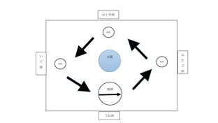 うお座の地球を大きく書き直して、日本列島でも書いて、「大阪から東京の方向」とか「九州から北海道の方向」なんて説明すればいいと思います。