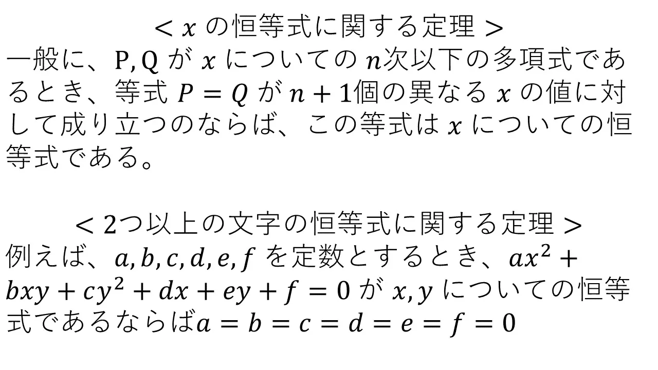 以上の前提によって、<2つ以上の文字の恒等式とその係数>の事項を確認します。