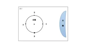 地球を北極の上から見た図(円)で、太陽の光の当たっている側と当たっていない側を、北極(中心)を通る直径で二分し、朝はどこか、夕方はどこか、正午はどこか、真夜中はどこか、確認すること。