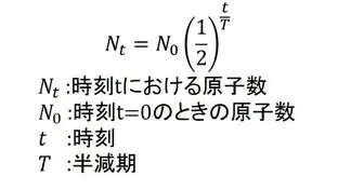 範囲が物理になるので詳細は割愛しますが,時間がたつにつれて原子数が半分(=1/2)になる現象があり,時刻tのときの原子数を計算するのに指数関数が利用されます.