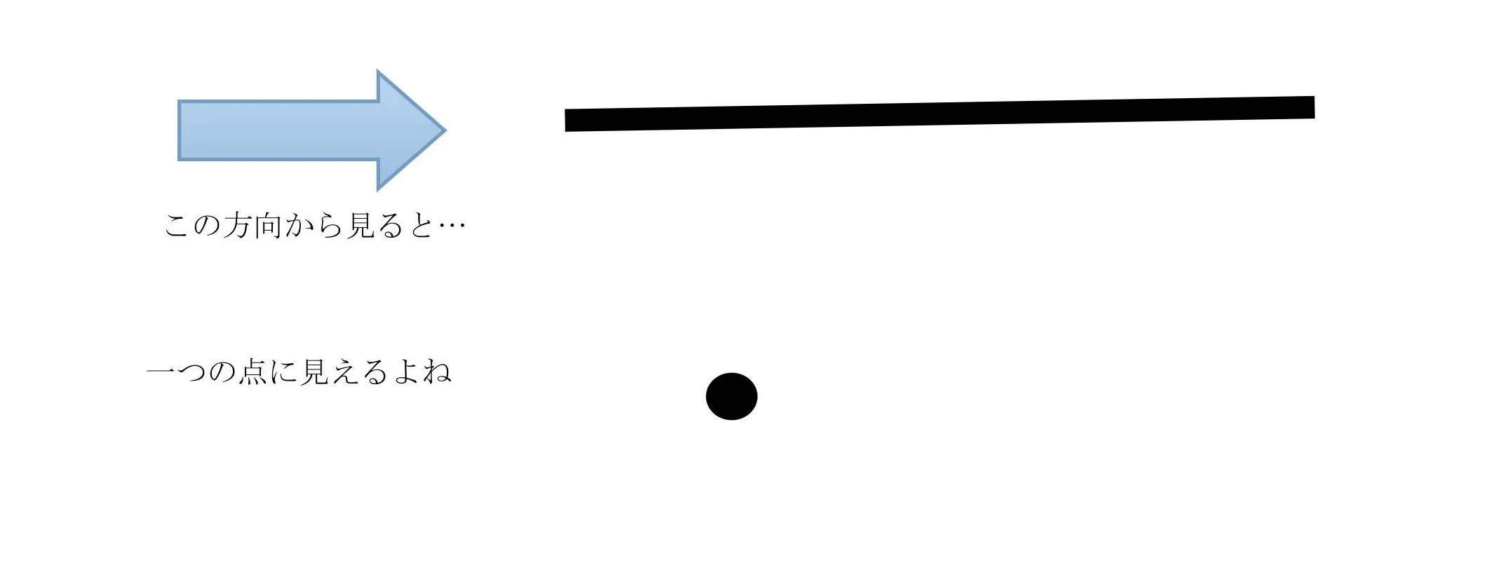 実際に、ペンでも棒でも使って、「横から見ると点になる」ということを示してください。
