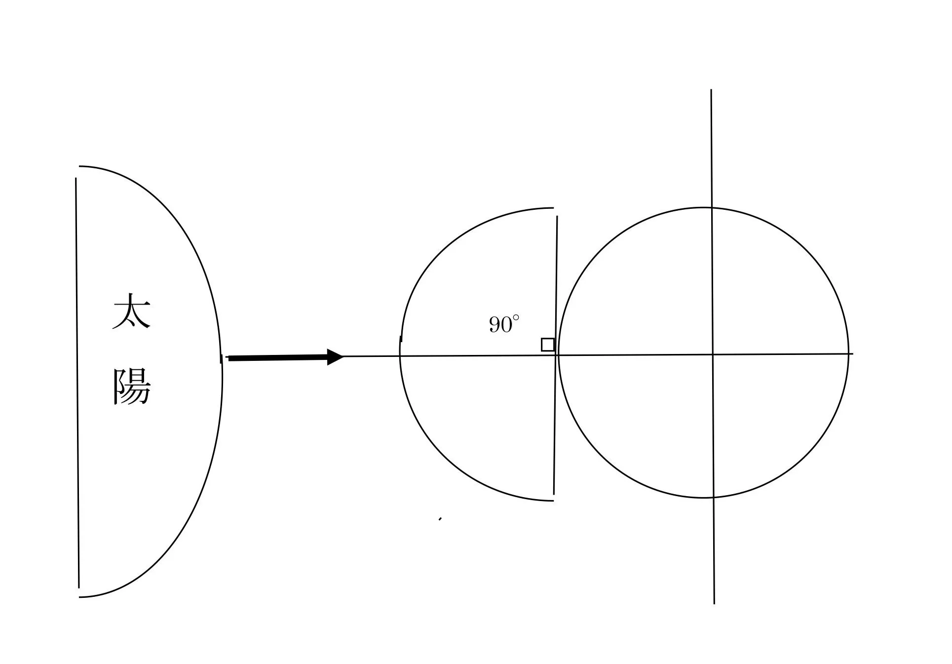 南中したときの様子は、図12のようになるんだったけど、このとき、太陽の光は赤道と平行になる。春分・秋分の日の赤道の南中高度は90度になるわけだ。