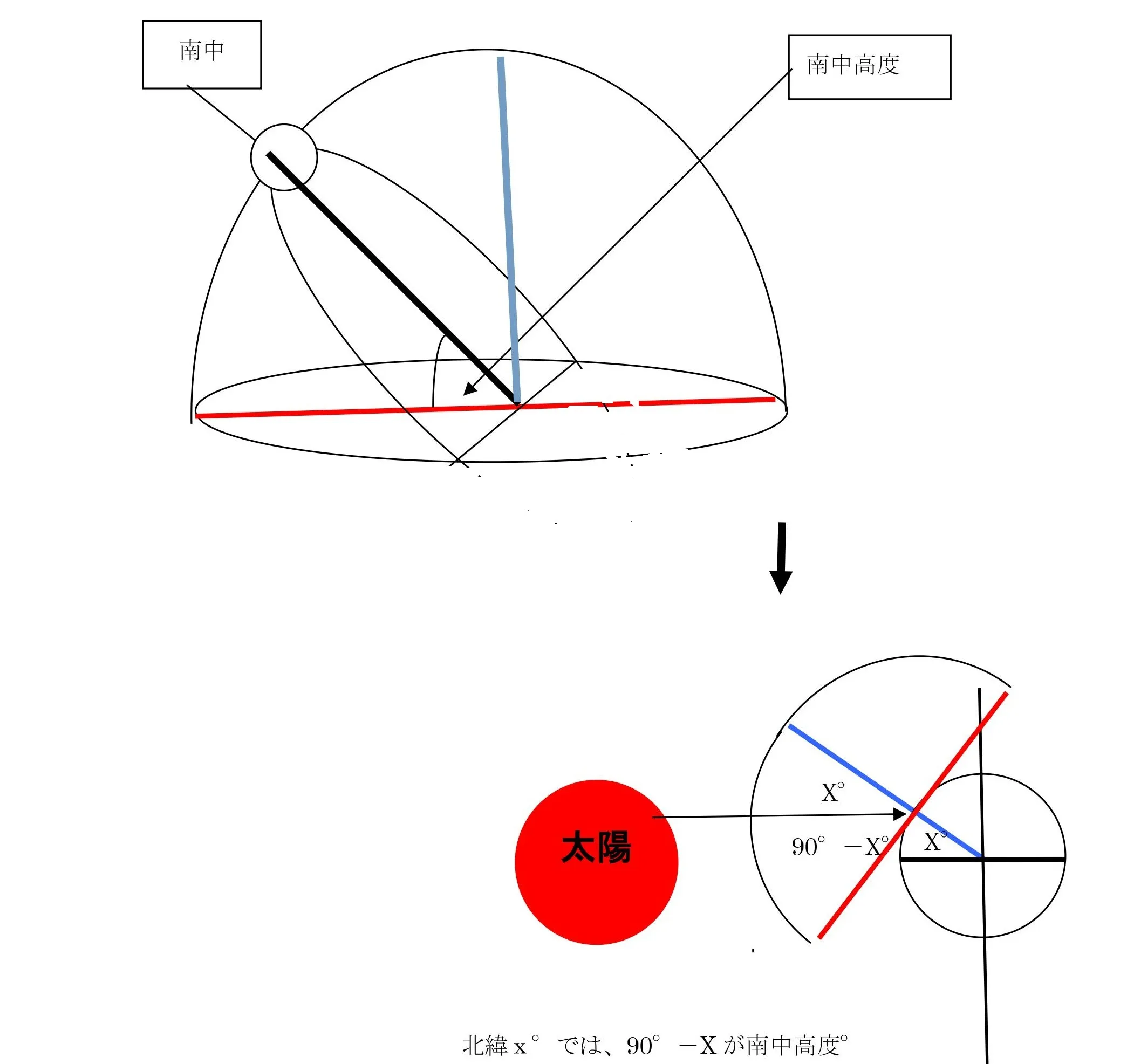 さて、図15を見る。緯度x°のところで太陽が南中したときの天球の図が上にある。