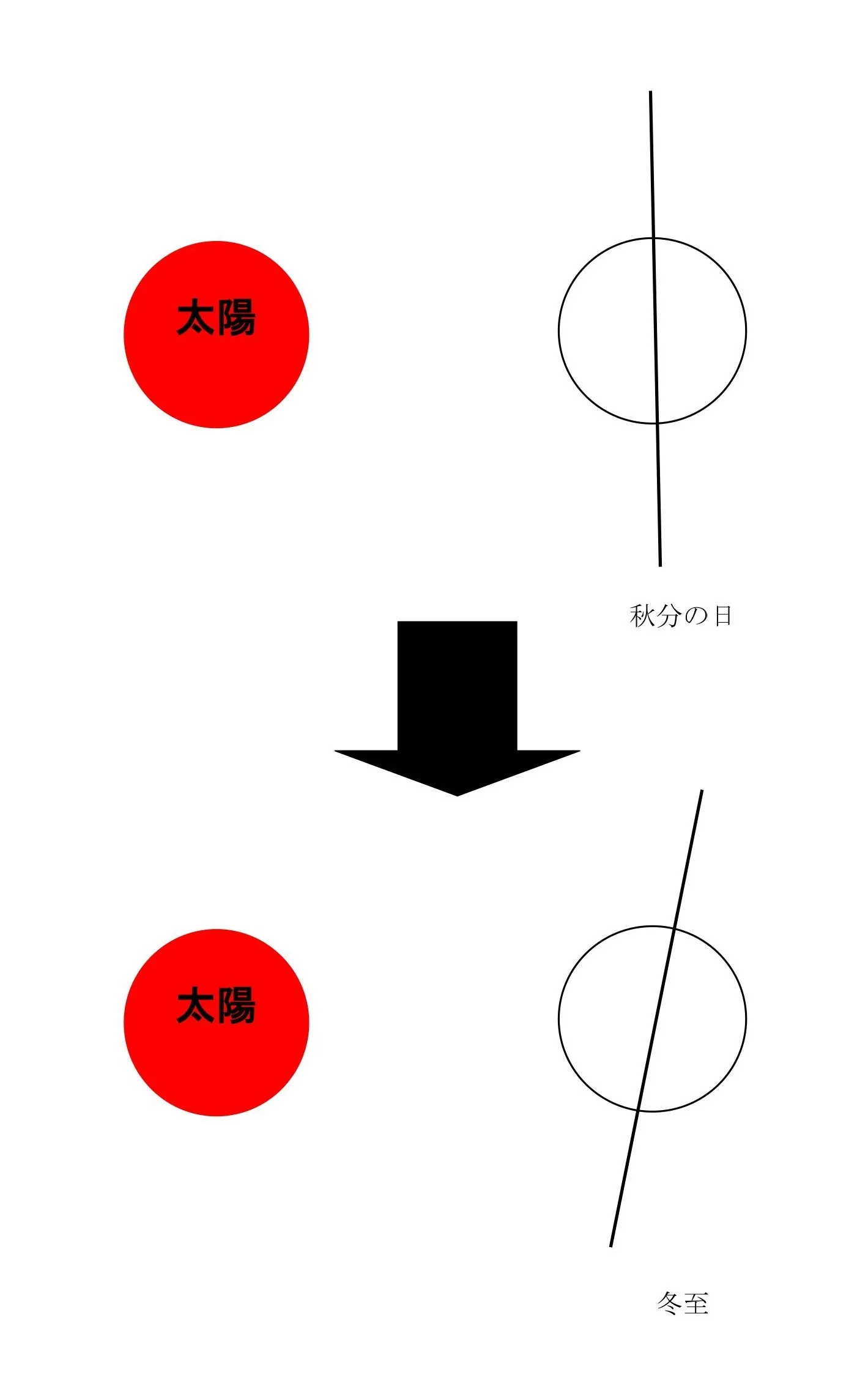 夏と冬は、それぞれ太陽の方に傾いたり太陽から遠ざかるように傾いたりするから、光の当たり方が変わった。