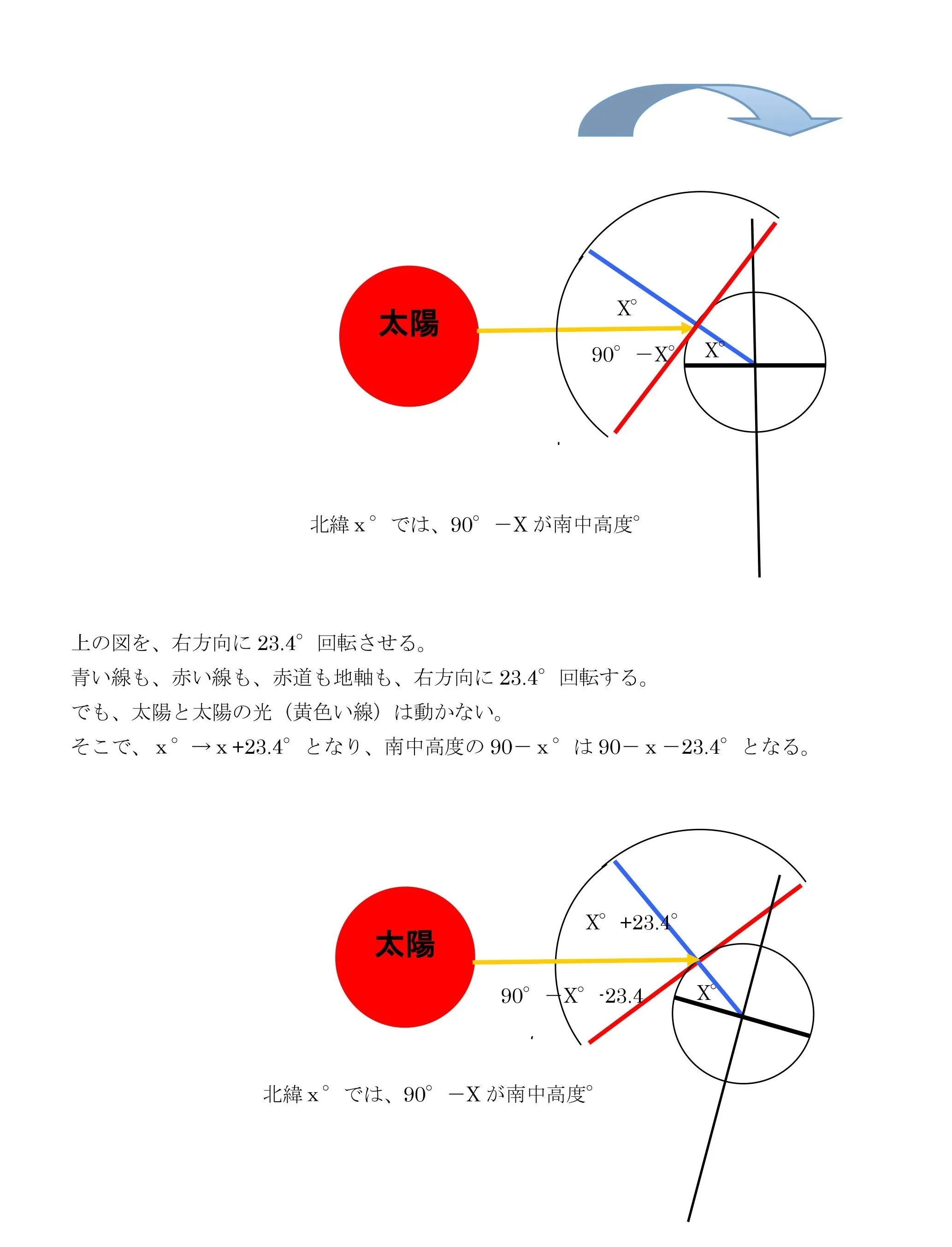 そこで、x°→x+23.4°となり、南中高度の90-x°は90-x-23.4°となる。