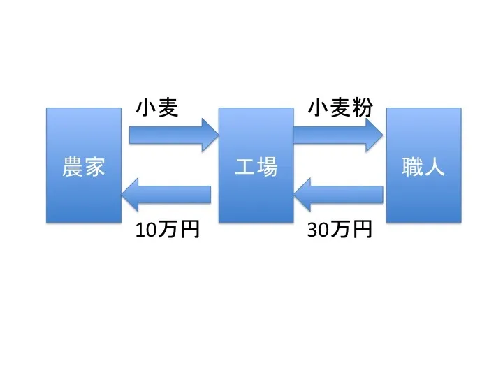 工場はその10万円の小麦を使い、30万円の小麦粉を作りました。ゆえに工場はその差額である20万円分の生産をしたと言えます。