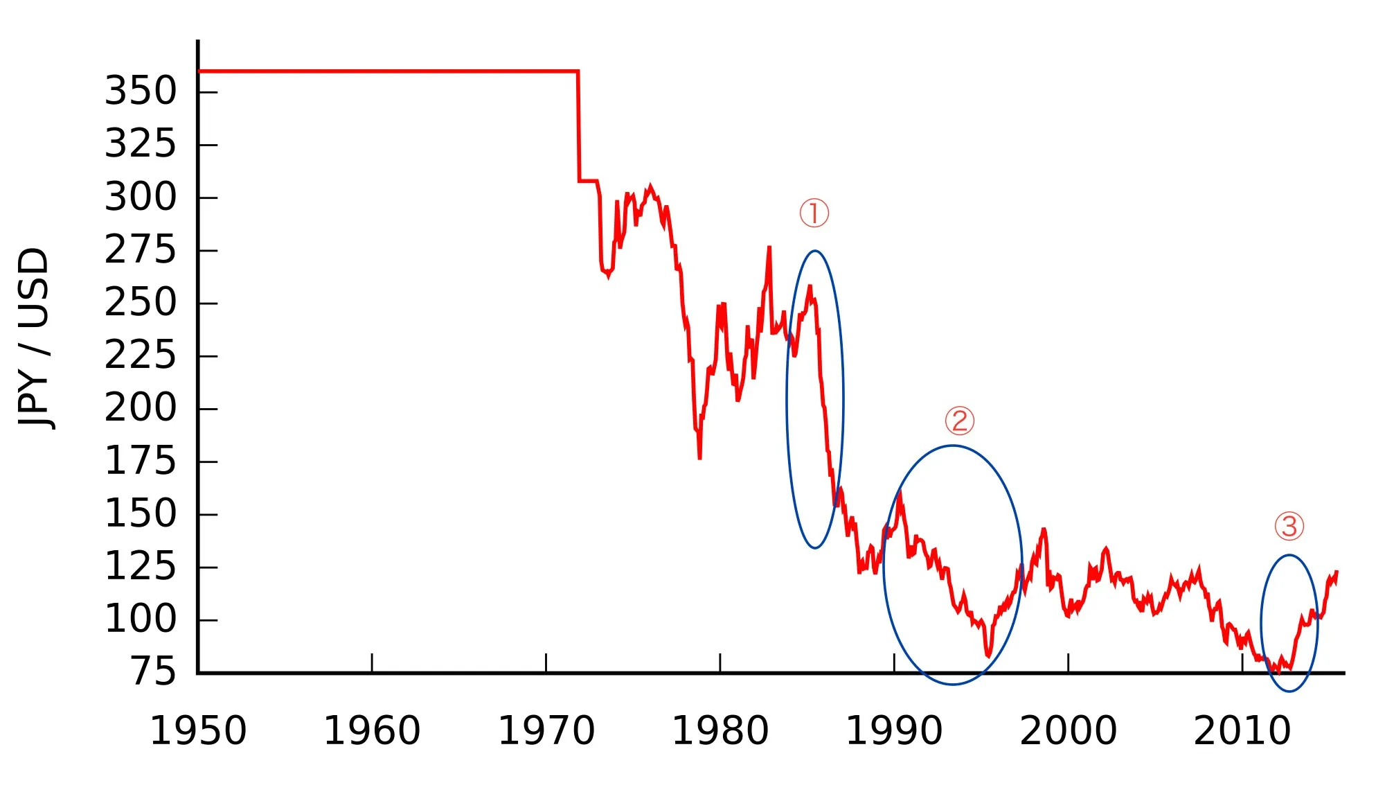 最初の方は固定為替相場制であったため、1ドル360円で固定されていました。