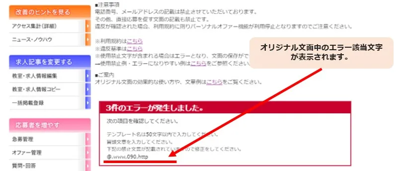 文面からエラー該当文字を削除し、再度保存をお願い致します。
