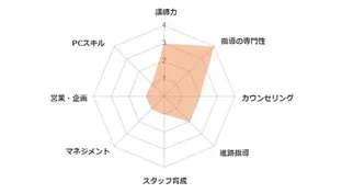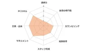 チャート内の項目は、学習塾で働く場合に主に求められる能力について一覧化しております。