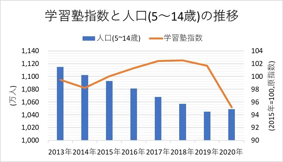 グラフでは、2020年の学習塾指数が減少していますが、新型コロナウイルスの影響によるもので、その後は持ち直しの動きを見せており、回復傾向にあります。