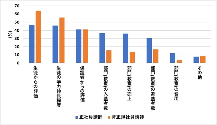 塾講師の成果や業績を測る指標はどれだけの生徒が入塾したか、どれだけ売上を伸ばしたかではありません。むしろ、保護者からの評価の重要度が高く、上記の図にあるように3番目に重要視されている指標なのです。