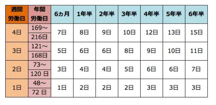 以下のテーブルに分かりやすくまとめてみました。なお、勤務時間は関係ありません。週に勤務する日数か年間労働日数を基準に付与されます。
