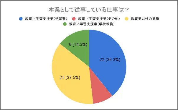 - 62.5%(56名中35名):教育関係(学習塾、学校教員、その他)