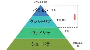 ヴェーダ時代は、その前半期に中央アジアからアーリヤ人が進出してきました。彼らは様々な自然神の崇拝と祭式を用いて政治を行いました。そうした祭式を開催する司祭たち(バラモン)が重視されるようになってきました。これがまさにバラモン教の始まりです。このバラモン教においてなされた集団の区分がヴァルナと呼ばれるものです。(右図を参照)これに各種の職能集団や部族集団が取り込まれることによって「生まれ・職能」という意味であるジャーティが広まりました。そして現在でも続くカースト制度が出来上がるのです。ちなみにここで挙げたバラモン教ですが、聖典としては『リグ・ヴェーダ』を始めとする4つのヴェーダが用いられました。ヴェーダとは、神々を称える歌や儀式をまとめたものです。