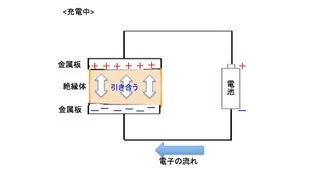 コンデンサと電池を繋いだ場合を考えてみましょう。電池は、マイナス極からプラス極に電子を流そうとします。しかし、コンデンサ内に絶縁体があるのでコンデンサ内を電子が通過することができません。その結果、コンデンサの負極側の金属板に電子が溜まります。金属板上の電子がいっぱいになったら(導線の電流が流れなくなったら)充電が終わります。