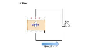 充電されたコンデンサと電球を繋いだ場合を考えてみましょう。金属板上の電子が導線を通って反対側の金属板へ移動します。蓄えられた電子が移動し終えるまで、電球は光ります。