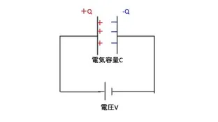 電圧Vをかけて、コンデンサに+Q と-Q の電気量が蓄えられるとします。