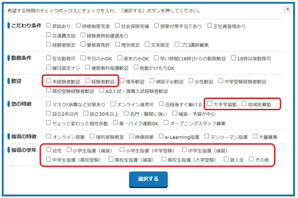 塾講師ステーションキャリアの検索では、その他の様々な条件を設定することが可能です。