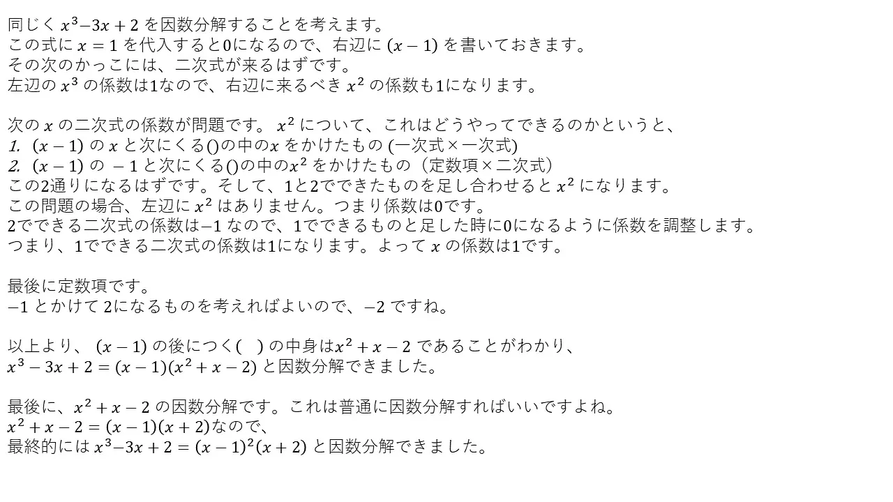 以上で紹介した方法で組立除法よりもはやく因数分解できるかどうかは個人差があると思いますが,もしこの方法が簡単だなと思われたら使っていただければ,と思います。