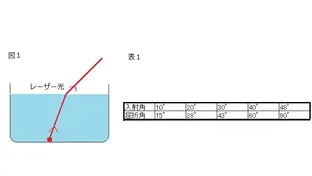 ① 図Ⅰのように、レーザー光を水と空気の境界面に向けて入射させ、入射角を10度から少しずつ大きくし、屈折角が90度になるまで入射角と屈折角を測定した。