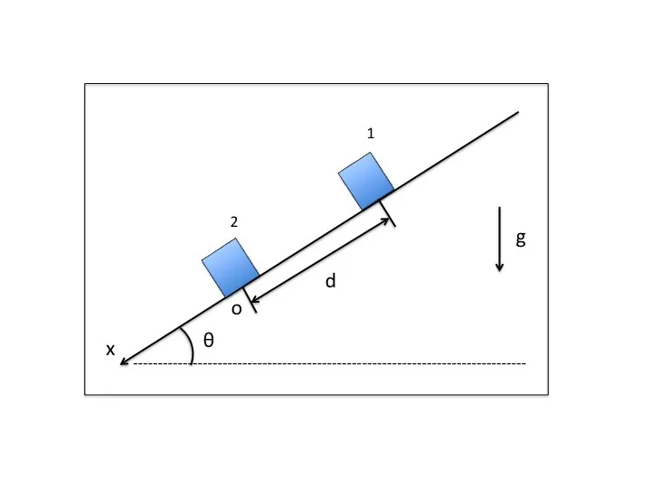 図のように大きさの無視できる質量m1,m2の物体1,2を水平面と角度θをなす斜面に沿って距離d離れた位置におく。