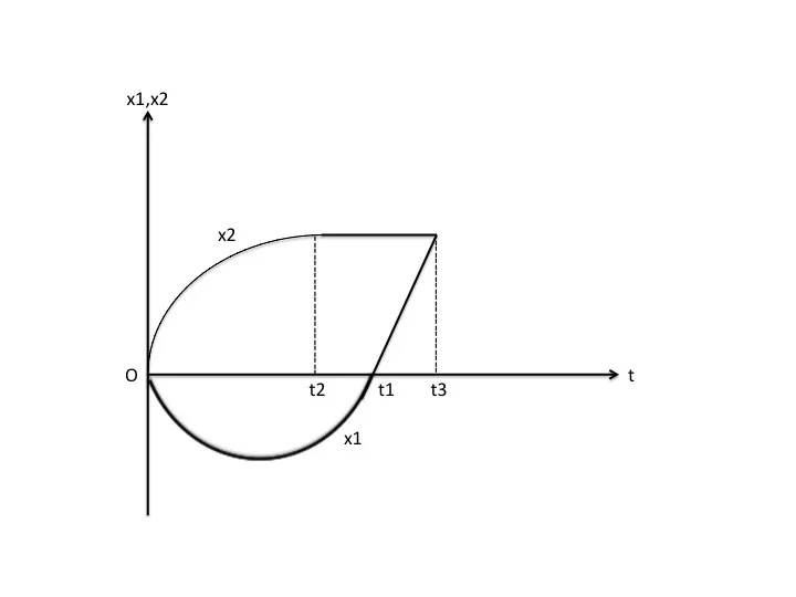 →グラフの概形を描くだけだからt=0,t1,t2,t3(物体の動きが変わる時刻)でのそれぞれの物体の位置x1,x2がわかればよさそう。