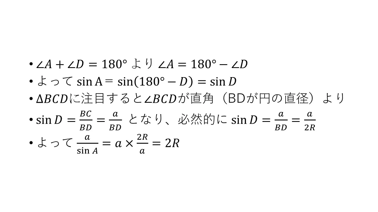 こちらは余弦定理に比べて図で直感的に理解できる分容易です。正確には3パターンに分けることができますが、基本は全て変わらなくて「三角形に対して外接円を描くこと」です!